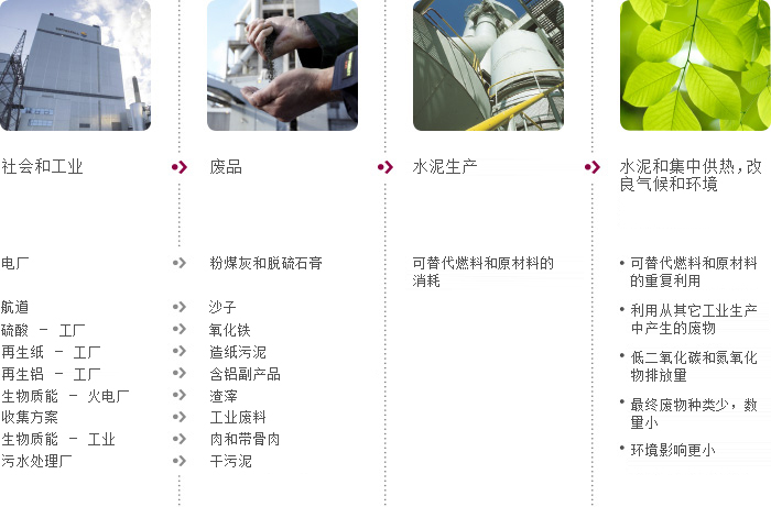 通過在水泥生產(chǎn)過程中回收和有效利用燃料和備選原材料,廢料和副產(chǎn)品得到了充分利用。所有成分得到了消耗而沒有新的副產(chǎn)品產(chǎn)生。